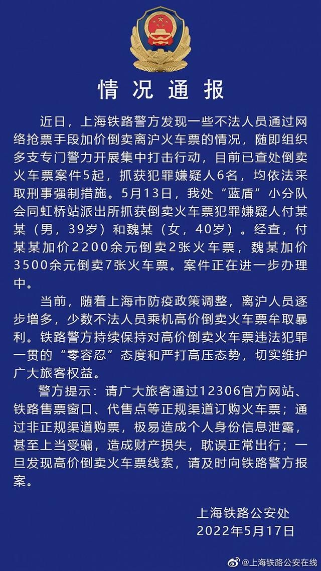 @ 上海铁路公安在线 微博17日发布情况通报称,近日,上海铁路警方发现一些不法人员通过网络抢票手段加价倒卖离沪火车票的情况,随即组织多支专门警力开展集中打击行动,目前 已查处倒卖火车票案件5起,抓获犯罪嫌疑人6名,均依法采取刑事强制措施。5月13日,我处“蓝盾”小分队会同虹桥站派出所抓获倒卖火车票犯罪嫌疑人付某 某(男,39岁)和魏某(女,40岁)。经查,付某某加价2200余元倒卖2张火车票,魏某加价3500余元倒卖7张火车票。案件正在进一步办理中。