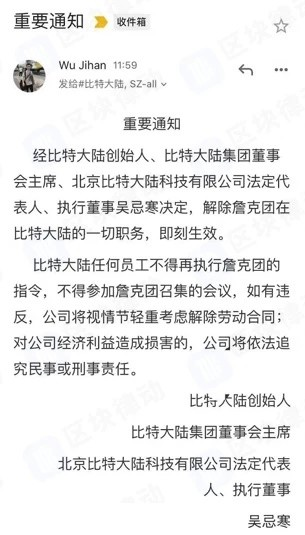 10月29日,吴忌寒发布全员邮件,称解除詹克团在比特大陆的一切职务,即刻生效。比特大陆任何员工不得再执行詹克团的指令,不得参加詹克团召集的会议。