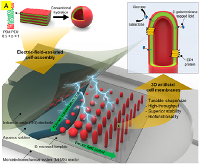 研究团队开发了一种技术,在硅基板上定期排列数万个直径为8微米的孔,并通过表面处理将特定量的BCP溶液插入每个孔中,然后将其干燥。通过在微流体通道 的上板电极和下硅基板之间施加电场,可调谐地创建肥皂泡形、细长椭圆形或细管形BCP双层结构。这个过程导致团队发现了根据溶液浓度和施加的电场频率维持 结构的可能性,也提出了一种可自由控制人造细胞膜大小和形状的方法。