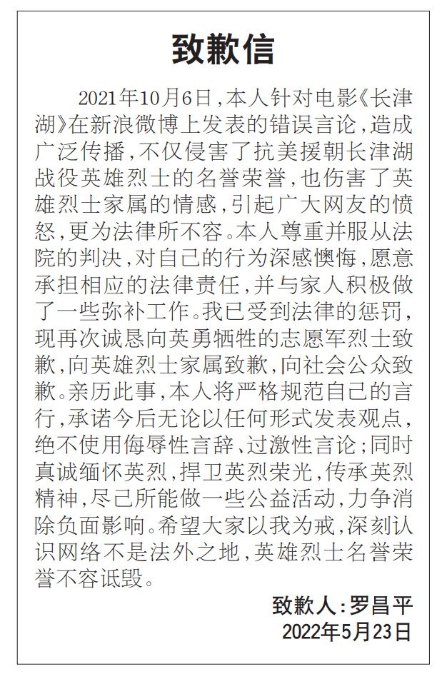 2021 年10月6日,本人针对电影《长津湖》在新浪微博上发表的错误言论,造成广泛传播,不仅侵害了抗美援朝长津湖战役英雄烈士的名誉荣誉,也伤害了英雄烈士家 属的情感,引起广大网友的愤怒,更为法律所不容。本人尊重并服从法院的判决,对自己的行为深感懊悔,愿意承担相应的法律责任,并与家人积极做了一些弥补工 作。我已受到法律的惩罚,现再次诚恳向英勇牺牲的志愿军烈士致歉,向英雄烈士家属致歉,向社会公众致歉。亲历此事,本人将严格规范自己的言行,承诺今后无 论以任何形式发表观点,绝不使用侮辱性言辞、过激性言论;同时真诚缅怀英烈,捍卫英烈荣光,传承英烈精神,尽己所能做一些公益活动,力争消除负面影响。希 望大家以我为戒,深刻认识网络不是法外之地,英雄烈士名誉荣誉不容诋毁。