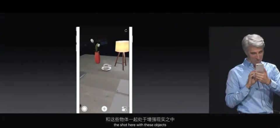 在当年的 WWDC 上,苹果软件工程高级副总裁克雷格·费德里吉(Craig Federighi)手握一台 iPhone 7,在他面前的桌子上放了一杯咖啡、一盏灯,以及一个花瓶。当然,它们都是虚拟的。