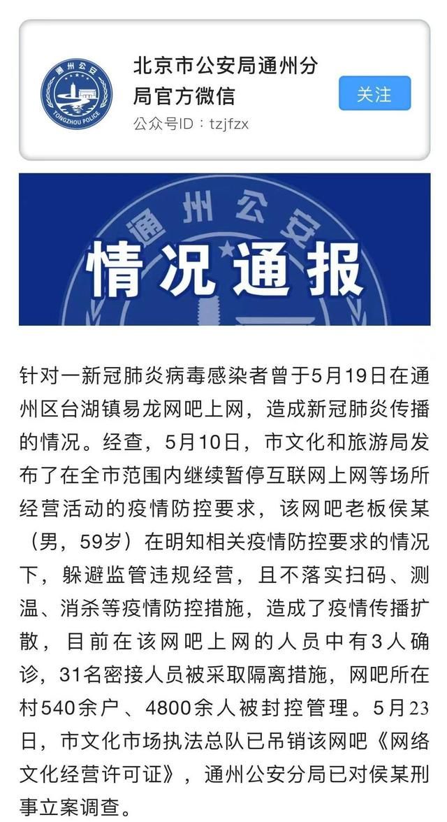 “通州警方在线”今天凌晨发布针对一新冠肺炎病毒感染者曾于5月19日在通州区台湖镇易龙网吧上网,造成新冠肺炎传播的情况说明。