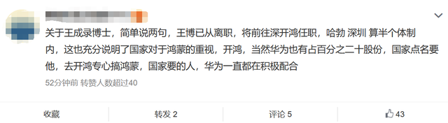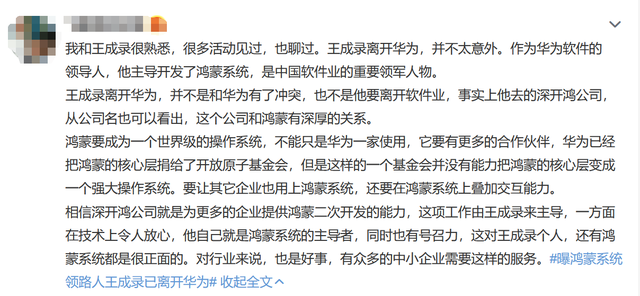 还有自称“和王成录很熟悉”的博主发文称,王成录离开华为,并不是和华为有了冲突,也不是他要离开软件业,“事实上他去的深开鸿公司,从公司名也可以看出,这个公司和鸿蒙有深厚的关系。”