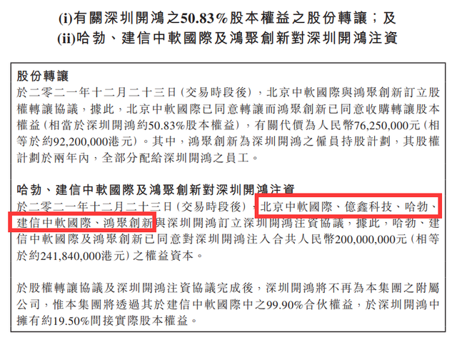 深 开鸿和中软国际亦有较强的联系。观察者网查询公开信息发现,深开鸿原本是由中软国际与深圳国资合资成立,且中软国际持股超过50%。但2021年12月, 中软国际与亿鑫科技、华为哈勃投资、鸿聚创新等各方注资深开鸿签署合计2亿元的注资协议。转让深开鸿股权后,中软国际的持股比例降至19.5%,