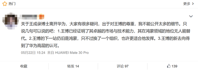 王成录原本在微博注册有个人账号,并带有华为公司认证,但日前这一认证突然取消,让业内感到错愕。随后,微博上有数码博主爆料称,王成录已离开华为,但下一站仍与鸿蒙有关,“只不过换了一个组织,也许更适合他发挥,新去向得到了华为高层的认可”。