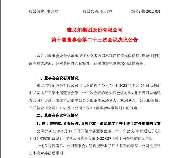 依据规定,捐赠事项尚需提交雅戈尔6月2日召开的2022 年第一次临时股东大会审议。不过,没等到股东大会举行,雅戈尔5月23日就再次公告表示,公司董事会、管理层听取了广大股东的意见,公司决定终止本次对外捐赠事项。