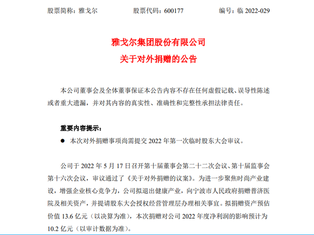 雅戈尔称,拟捐赠资产预估价值13.6亿元(以决算为准),本次捐赠对公司2022年度净利润的影响预计为10.2亿元(以审计数据为准)。