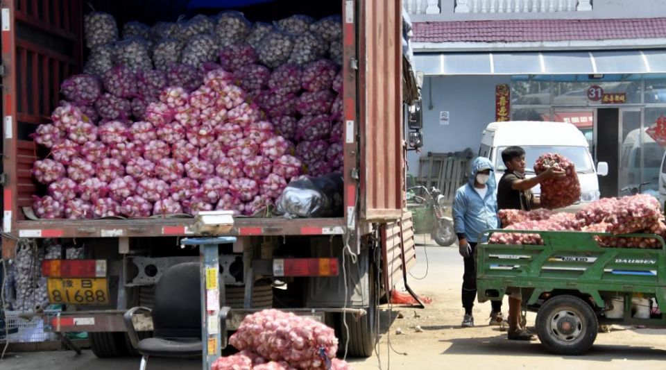 5月20日,商家在北京新发地市场搬运大蒜。(新华社记者 李欣 摄)