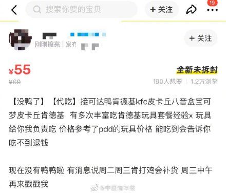 六一儿童节即将来临,肯德基推出的儿童节套餐玩具之一可达鸭玩具在全网爆火。不仅多家肯德基门店玩具 断货,二手市场还出现了“代吃”和炒作高价的现象。据武汉晨报消息,肯德基客服表示,网上高价出售可达鸭音乐盒属个人行为,与公司无关。并称,公司不会将 赠品单独出货卖给“黄牛”,目前不确定网上出售的可达鸭的货源。来源:中国青年报