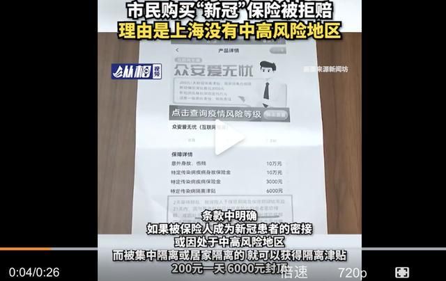 今年3月8日,沈女士花 59元买了一份众安爱无忧保险,这款保险以"新冠"为主打卖点,条款中明确,如果被保险人成为新冠患者的密接,或因处于中高风险地区,而被集中隔离或居家 隔离的,就可以获得隔离津贴,200元一天,6000元封顶。然而,当沈女士因为所住小区长时间封控,去申请隔离津贴时,保险公司却几次三番拒绝赔付,理 由是“这段时间内,上海并没有中高风险地区”的说法。