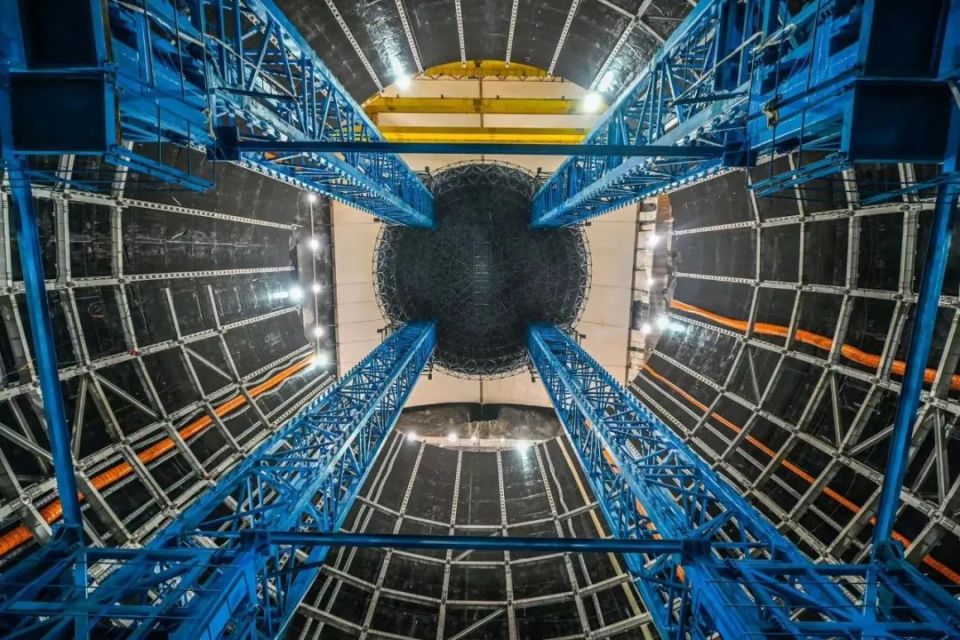 “变形金刚塔”——有机玻璃球安装升降平台(仰视图)。中国科学院高能物理研究所供图