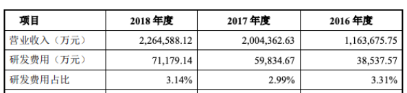 廉价开拓市场,传音控股的研发能力并不出众。招股书表明,2016至2018年度,传音控股营收从116亿元跨入200亿关口,研发费用则从3.8亿元增至7.1亿元,3个年度研发投入占营收比例分别为3.31%、2.99%和3.14%,紧贴3%的水平线。