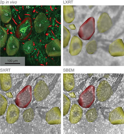 首先,研究人员使用体内钙成像来可视化大脑特定区域的神经元,并观察当小鼠暴露于气味时哪些神经元处于活跃状态。在对小鼠实施安乐死后,他们使用各种方法 对脑组织样本进行成像,包括同步加速器X射线断层扫描,该方法可捕获长达几毫米的样本。这种规模足以让科学家看到整个神经网络,以及特定细胞或其他结构位 于样本更广泛背景下的位置,而且不会损坏该样品。