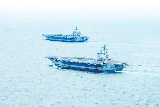 美第七舰队28日发布的图片显示,美双航母打击群在相关海域演练。