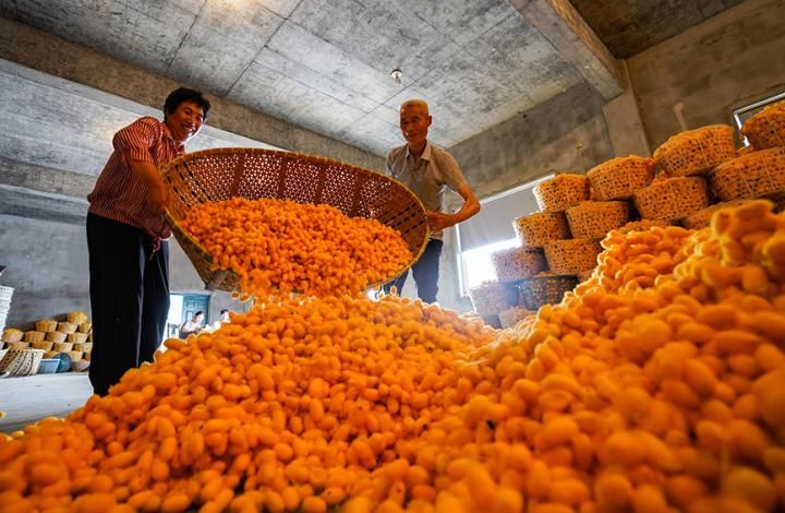 人民网嘉兴6月1日电 (孙鹏)日前,浙江省桐乡市凤鸣街道蚕农喜迎丰收,新茧种“黄金茧”产量喜人。