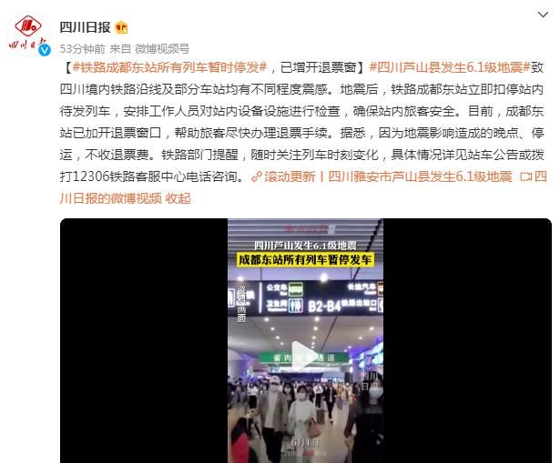 首页 铁路成都东站所有列车暂时停发,已增开退票窗 2022-06-02 08:51:45 分享 本文转自【四川日报】;【# 铁路成都东站所有列车暂时停发#,已增开退票窗】#四川芦山县发生6.1级地震#致四川境内铁路沿线及部分车站均有不同程度震感。地震后,铁路成都东站立 即扣停站内待发列车,安排工作人员对站内设备设施进行检查,确保站内旅客安全。目前,成都东站已加开退票窗口,帮助旅客尽快办理退票手续。据悉,因为地震 影响造成的晚点、停运,不收退票费。