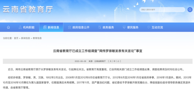上述消息中提到,近日,网传云南省教育厅原厅长罗崇敏发表有关言论,引起舆论关注。省教育厅高度重视,已会同相关部门成立工作组调查此事,调查结果将及时向社会公布。