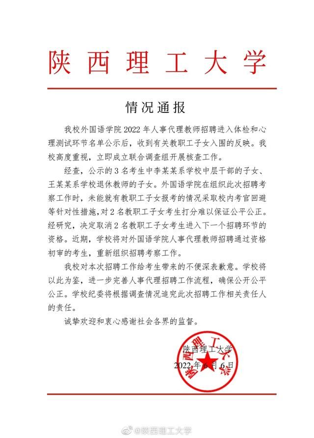 新京报讯 6月6日,针对网传“高校外语学院招聘3名教师中2人为领导子女”一事,陕西理工大学公布调查情况,称决定取消2名教职工子女考生进入下一个招聘环节的资格。通报全文如下: