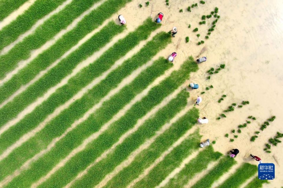 首页 我们的田野——三夏农忙好风景 2022-06-08 08:51:01 分享 6月7日,村民在贵州省黔东南苗族侗族自治州岑巩县大有镇腊恰畈村整理秧苗(无人机照片)。三夏时节,各地进入夏季农忙期,农民抢抓农时开展农事劳作,田间地头一派忙碌景象。新华社发(万再祥 摄)