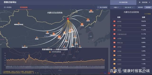 人 民日报健康客户端查询发现,内蒙古迁出目的地主要为陕西、辽宁、河北等省份。以6月3日端午假期首日为例,陕西占内蒙古迁出人口总量的18.62% ;辽宁次之,占总量的14.84% ;河北为11.22% 。排在前10名的目的地还有:宁夏、山西、黑龙江、吉林、山东、甘肃、河南。