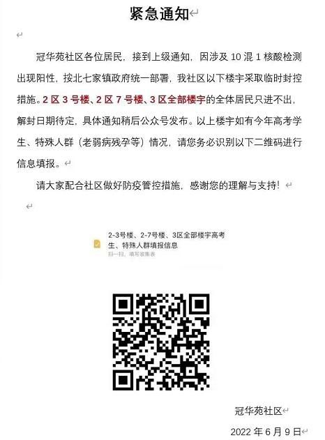 首页 10混1检出阳性,北京昌平冠华苑社区部分楼宇临时封控 2022-06-09 14:58:16 分享 6月9日上午,昌平区北七家镇冠华苑社区发出通知,因涉及10混1核酸检测出现阳性,按北七家镇政府统一部署,社区2区3号楼、2区7号楼、3区全部楼宇采取临时封控措施,全体居民只进不出,解封日期待定。来源 北京日报客户端记者 孙云柯编辑 王琼流程编辑 严圣淼