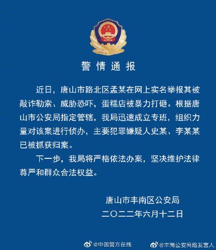 首页 唐山打砸蛋糕店案2名嫌犯被抓获 2022-06-13 08:35:43 分享 近日,唐山市路北区孟某在网上实名举报其被敲诈勒索、威胁恐吓,蛋糕店被暴力打砸。根据唐山市公安局指定管辖,唐山市丰南区公安局迅速成立专班,组织力量对该案进行侦办,主要犯罪嫌疑人史某、李某某已被抓获归案。