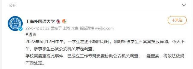 首页 上海外国语大学:一学生向同学杯中投异物 已被警方带走 2022-06-13 11:06:41 分享 央视网消息:据上海外国语大学消息:6月12日中午,一学生在图书馆自习时,咖啡杯被学生尹某某投放异物。今天下午,涉事学生已被公安机关带走调查。学校高度重视此事件,已成立工作专班负责协助公安机关调查,一经查实,将依法依规严肃处理。