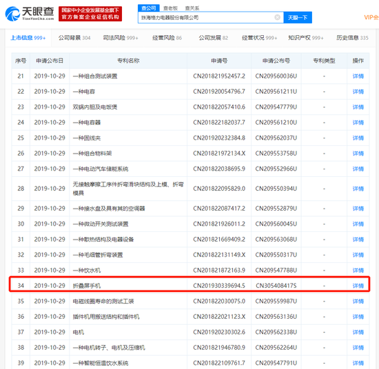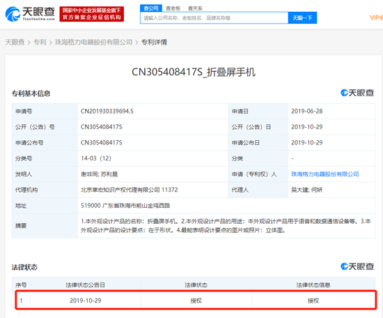 天眼查数据显示,10月29日,珠海格力电器股份有限公司新增折叠屏手机专利,专利摘要包括:1.本外观设计产品的名称:折叠屏手机。2.本外观设计产品的用途:本外观设计产品用于语音和数据通信设备等。3.本外观设计产品的设计要点:在于形状。4.最能表明设计要点的图片或照片:立体图,该专利的法律状态以及法律状态信息均为:授权。