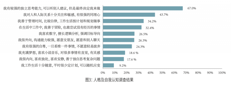 “自律”“善于管理时间”“敢于冒险,具有好奇心”这些特质的占比都超过30%,是当今企业家们自我认知中较为显著的特征 (见图3:人格及自我认知调查结果) 。