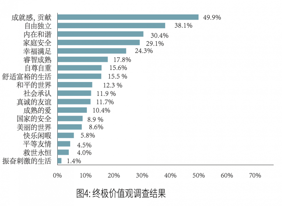 第四位是“家庭安全”,这个价值观在十年前是没有的 (见图4: 终极价值观调查结果) 。过去20年,中国经济飞速发展,也带来了下海经商,离家打工的热潮。其代价也是巨大的——许多人失去了正常的家庭生活,空巢老人、留守儿童得不到应有的照顾。这个结果显示:经历这个阶段后,更多人开始回归家庭,意识到家庭幸福在人生成长中的重要性。同时,在百年不遇的新冠疫情中,很多家庭失去的亲人;疫情反复让许多人感到缺乏安全感,这也是导致“家庭安全”占比升高的原因。