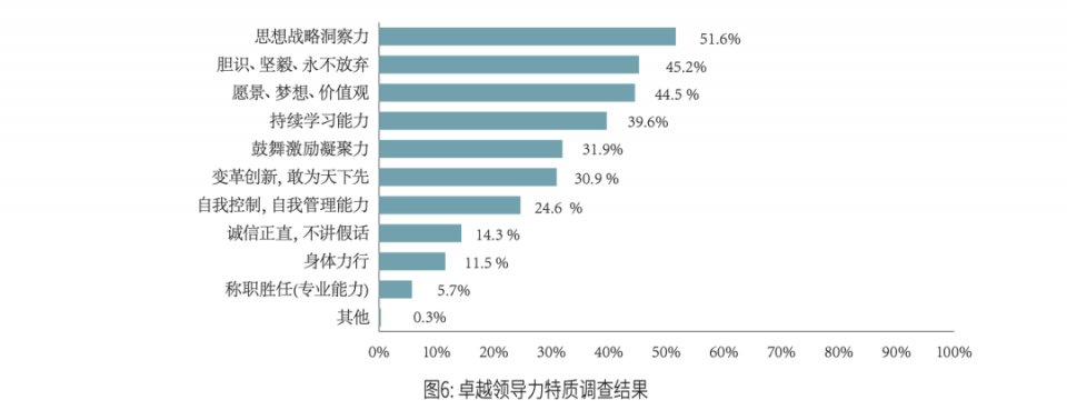 紧接着是“愿景、梦想和价值观”,比例达到44.5%;排第四位的是“持续学习的能力”,占39.6%。这两条是我们最为熟悉的领导力特质,是最基本的领导力组成要素和能力 (见图6: 卓越领导力特质调查结果) 。