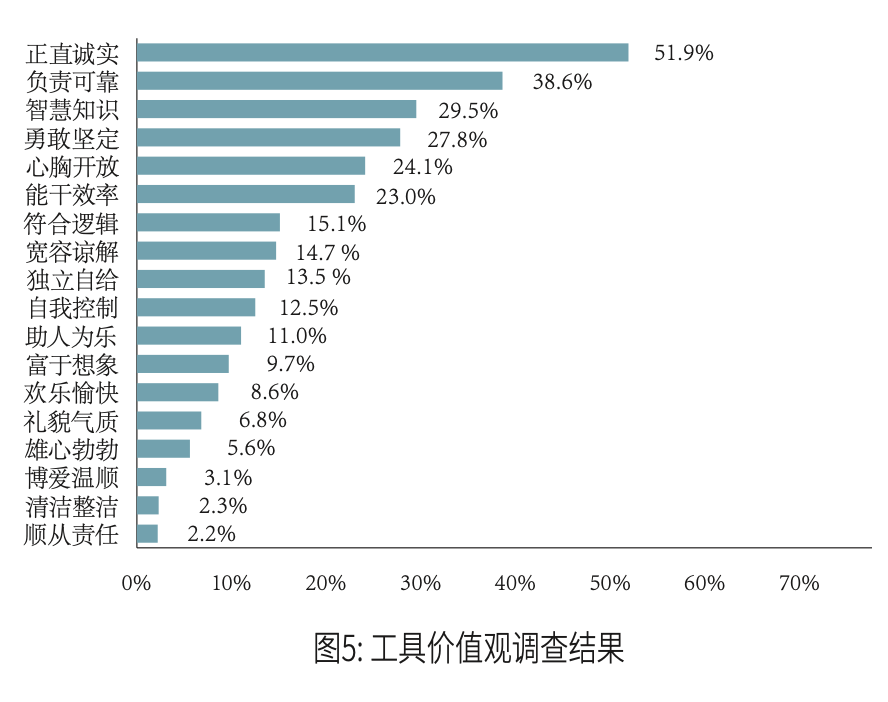 工具价值观——正直与可靠。在这项调查中, 51.9%的受访者选择“正直诚实”,占据首位。回想2002年我首次用罗克奇问卷调查商学院学生的价值观排序时,平均排序结果显示,“正直诚实”被排在几乎最后位置——第17位,与今天的调研结果反差巨大。当时的中国正值经济全面腾飞时代,商机无数,“正直诚信”在商业活动中不被重视。今天,超过一半的人把“正直诚实”选为工具价值观的第一位,这是中国社会一个重大进步。