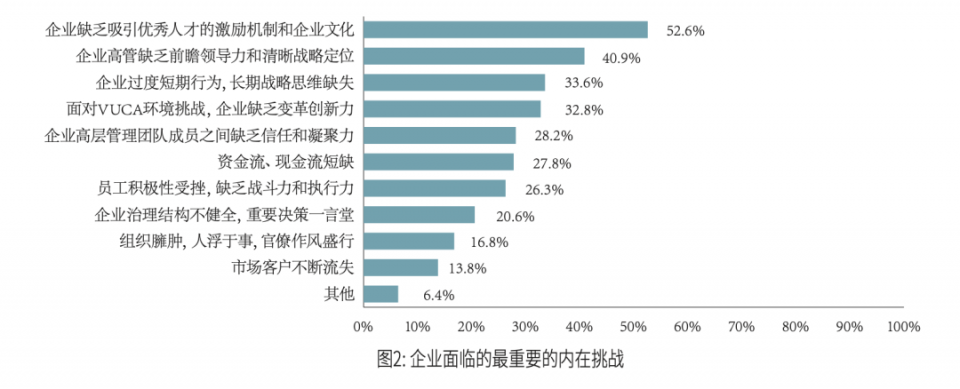 排名第三、第四的是“企业存在过度短期行为,长期战略行为消失”(33.6%)、“面对VUCA环境挑战,企业缺乏变革创新力”(32.8%),也显示出中国企业对短期环境变化和竞争,以及这些对长期战略影响的焦虑 (见图2: 企业面临的最重要的内在挑战) 。