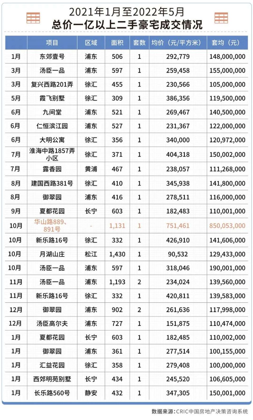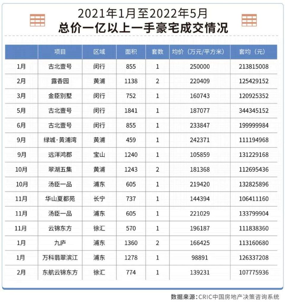可供参考对比的CRIC数据是,2021年以来,上海总价1亿以上的豪宅(含新房和二手房)一共只成交了45套。