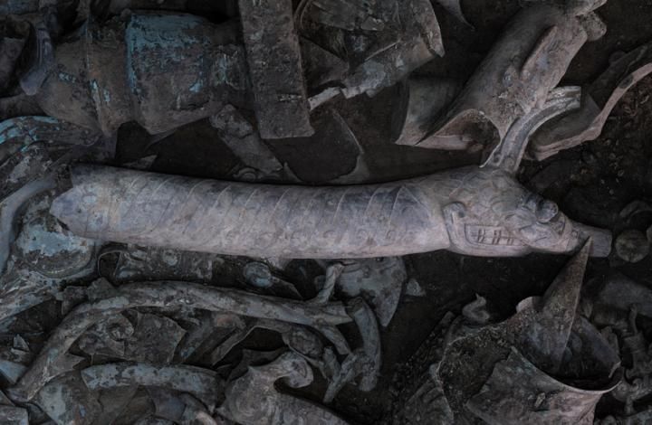 据介绍,6座坑共计出土编号文物近13000件。其中,7号坑出土706件,包括铜器383件、金器52件、玉器140件、石器1件、象牙62件、 其他 68件;8号坑出土1052件,包括铜器68件、金器368件、玉器205件、石器34件、象牙377件。较为典型的文物有7号坑的龟背形网格状器、铜顶 璋龙形饰、三孔玉璧形器,8号坑的金面罩铜头像、顶尊蛇身铜人像、铜神坛、铜巨型神兽、铜龙、铜立人像、铜戴象牙立人像、铜猪鼻龙形器等。