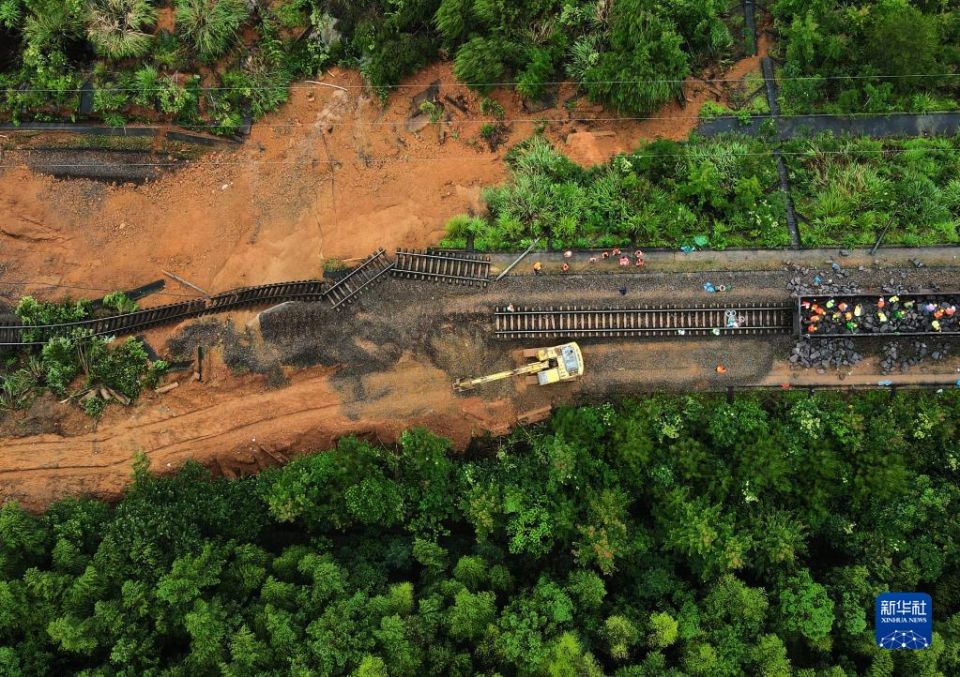 首页 福建龙岩暴雨抗灾救灾一线直击 2022-06-15 09:10:06 分享 位于龙岩市长汀县的赣龙线金峰山站至长汀站区间路堤塌陷现场(6月14日摄,无人机照片)。连日来,福建多地出现持续强降雨,位于闽西的龙岩市遭遇多轮局地性、突发性极端暴雨天气,造成不同程度受灾。面对灾情,龙岩市全力以赴救灾安置,强化落实巡查排查、人员转移等各项防范措施。截至13日10时,该市各级党员干部累计34000多人次下沉一线,全力保障群众生活所需与生命财产安全。新华社记者 魏培全 摄