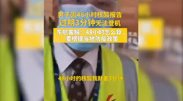 “我就差3分钟,国家规定,就是让你拿时间1分1秒在这里计时吗?”一名男子因为48小时核酸检测报告过期3分钟而无法登机,他拍下与东方航空地服工作人员沟通的视频上传网络,认为自己无法登机,是东航四川分公司地服工作人员太过死板。