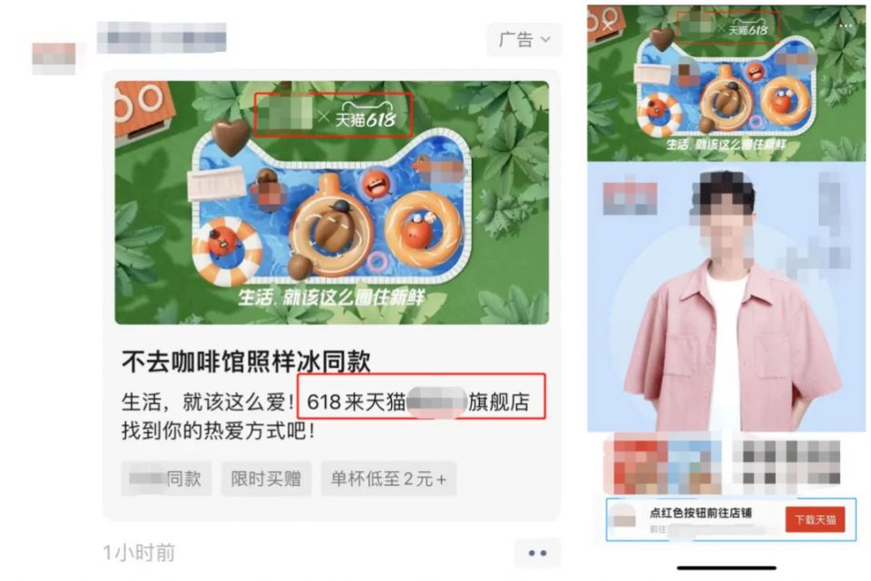 图注:某品牌天猫618朋友圈广告和第一次跳转页面 图源:亿邦动力