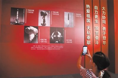 2021年9月2日,一位小女孩正在中国国家博物馆用手机拍摄 “两弹一星”精神展的展品。视觉中国供图