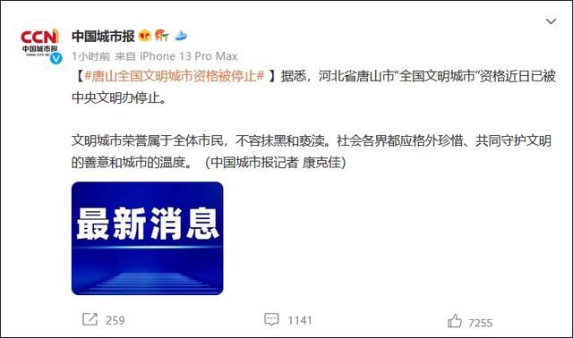 首页 唐山“全国文明城市”资格被停止 2022-06-22 08:46:49 分享 据@中国城市报 22日消息,据悉,河北省唐山市“全国文明城市”资格近日已被中央文明办停止。报道呼吁,文明城市荣誉属于全体市民,不容抹黑和亵渎。社会各界都应格外珍惜、共同守护文明的善意和城市的温度。