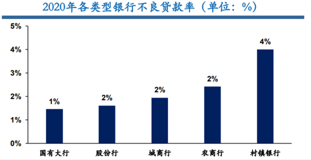 在 不良率方面,据华安证券(600909)研报统计,村镇银行的不良率明显高于城商行、农商行等。《2021年度村镇银行调研报告》显示,2018年、 2019年和2020年不良贷款率分别为3.66%、3.7%、4%。而截至2020年末,国有大行的不良率仅为1%,股份行不良率为2%,城商行不良率 为2%,农商行不良率为2.4%。