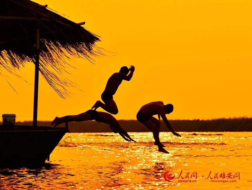 炎炎夏日,打小在淀里长大的孩子们,在教练和家长的陪护下,一跃入水,享受清凉。郑国华摄