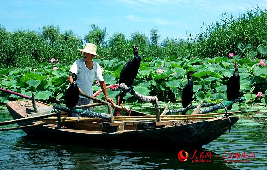 村民带着鱼鹰在淀里“遛弯”赏景。郑国华摄