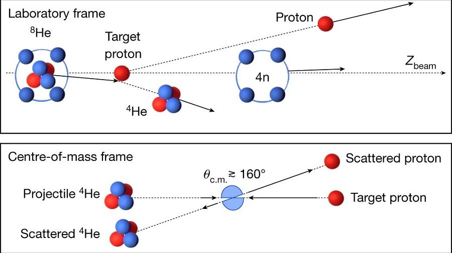 在最新研究中,慕尼黑工业大学的罗曼·格恩哈乌斯及其同事,制造出了比普通氦原子多4个中子的氦原子,然后让其与质子碰撞。这些氦原子在碰撞后只留下了4 个中子,而这4个中子可以结合形成“四中子态”。随后,研究团队测量了碰撞前后所有粒子的能量和动量,从而计算出碰撞形成“四中子态”后丢失的能量,并通 过这一能量推断出,“四中子态”的“寿命”仅为10—22秒。