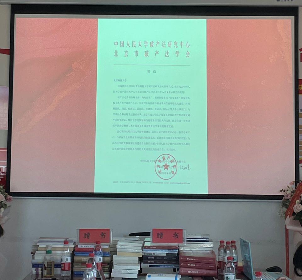 致辞环节之后,太原科技大学校党委副书记杨全平和山西省高级人民法院原审判委员会专职委员、一级高级法官仇拉锁共同为研究中心揭牌。破产法研究中心成立过程中,还得到了业内领导、知名学者的大力支持和高度关注,他们因疫情原因和时间关系虽不能亲临揭牌仪式,但第一时间发来了贺词,包括中国政法大学终身教授、博士生导师李德顺,原国务院法制办副主任、最高人民检察院原副检察长、全国政协原社会与法制委员会副主任委员张穹,北京大学法学院教授、博士生导师盛杰民,山西省法学会秘书长秦伟,中国人民大学破产法研究中心副主任兼秘书长、北京市破产法学会会长、中国人民大学教授、博士生导师徐阳光,《中国政法大学学报》编审、中国政法大学破产法与企业重组研究中心研究员陈夏红,《东方财经》杂志社社长邵济和,斯坦福大学博士后研究员刘忠。破产法研究中心主任卫霞现场宣读了贺词。