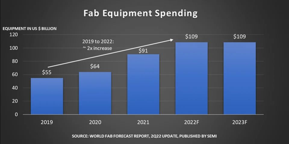 据国际半导体产业协会(SEMI)6月发布的《世界晶圆厂预测报告》(World Fab Forecast),2022年全球前端晶圆厂设备支出预计将比去年同期增长20%达1090亿美元;其中台湾地区晶圆厂设备支出预计340亿美元,其次韩国为255亿美元,第三大陆为170亿美元。