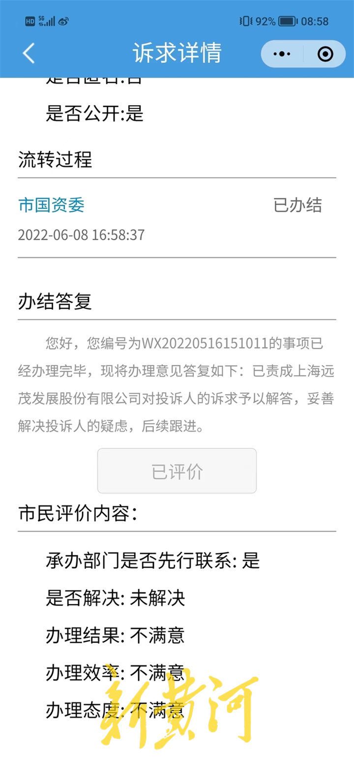 随后,周冬向“12345市民服务热线”反映情况,市国资委反馈:已责成上海远茂发展股份有限公司对投诉人的诉求予以解答,妥善解决投诉人的疑虑,后续跟进。