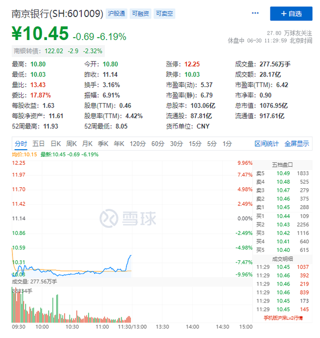 6月30日早间,南京银行(601009.SH)开盘大跌,盘中一度触及跌停,随后跌势逐渐减弱。截至午间休市,南京银行报10.45元/股,跌6.19%,总市值1076.95亿元。