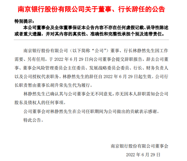 消息面上,6月29日晚间,南京银行公告称,公司董事、行长林静然因工作需要、另有任用,于6月29日向公司董事会提交辞职报告,辞去公司董事、董事会风险管理委员会主任委员、发展战略委员会委员、行长、财务负责人以及公司授权代表职务。其辞任自6月29日起生效。公司行长职责暂由董事长胡升荣代为履行。