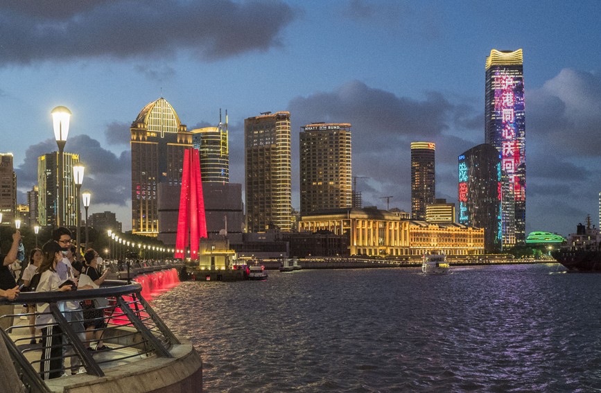 科创 上海:“浦江辉映耀回归”主题灯光秀上演 庆祝香港回归祖国25周年 2022-07-02 08:16:29 分享 2022年7月1日,上海,“浦江辉映耀回归”主题灯光秀上演。黄浦江两岸的白玉兰广场、花旗银行大厦亮灯,展示了庆祝香港回归祖国25周年的祝福语及动感影像。王初摄(人民图片网)